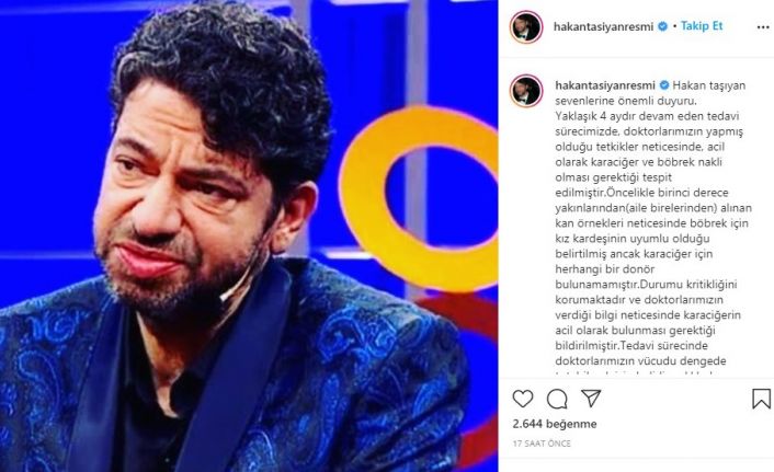 Yaklaşık 4 aydır hastanede tedavi gören Ünlü şarkıcı Hakan Taşıya’ın durumunun ciddiyetini koruduğu öğrenildi. Taşıyan’ın sosyal medya hesabından yapılan duyuruda acil böbrek ve karaciğer nakli olması gerektiği ifade edildi. Sosyal medyadan yapılan açıklamada, "Yaklaşık 4 aydır devam eden tedavi sürecimizde, doktorlarımızın yapmış olduğu tetkikler neticesinde, acil olarak karaciğer ve böbrek nakli olması gerektiği tespit edilmiştir. Öncelikle birinci derece yakınlarından(aile bireylerinden) alınan kan örnekleri neticesinde böbrek için kız kardeşinin uyumlu olduğu belirtilmiş ancak karaciğer için herhangi bir donör bulunamamıştır. Durumu kritikliğini korumaktadır ve doktorlarımızın verdiği bilgi neticesinde karaciğerin acil olarak bulunması gerektiği bildirilmiştir. Tedavi sürecinde doktorlarımızın vücudu dengede tutabilmek için belirli aralıklarla vücuttan su çekme işlemi ve diyaliz işlemi uygulanmaktadır. Hakan Taşıyan sevenlerinden dualarını eksik etmemesini ve Allah’ın izniyle sağlıklı günlere kavuşması ve sevenlerine tekrar “doktor” olmasını tüm kalbi duygularımızla diliyoruz. Yanımızda olan tüm kardeşlerimize sevgilerimizle” ifadeleri kullanıldı.Hakan Taşıyan’ın sosyal medyasından sevenlerine çağrı