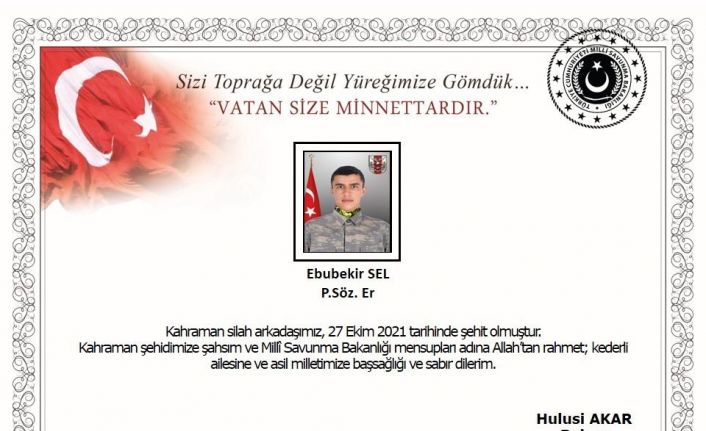 Milli Savunma Bakanlığından Hulusi Akar’ın yayımladığı taziye mesajında, “Kahraman silah arkadaşımız, 27 Ekim 2021 tarihinde şehit olmuştur. Kahraman şehidimize şahsım ve Milli Savunma Bakanlığı mensupları adına Allah’tan rahmet; kederli ailesine ve asil milletimize başsağlığı ve sabır dilerim” denildi.