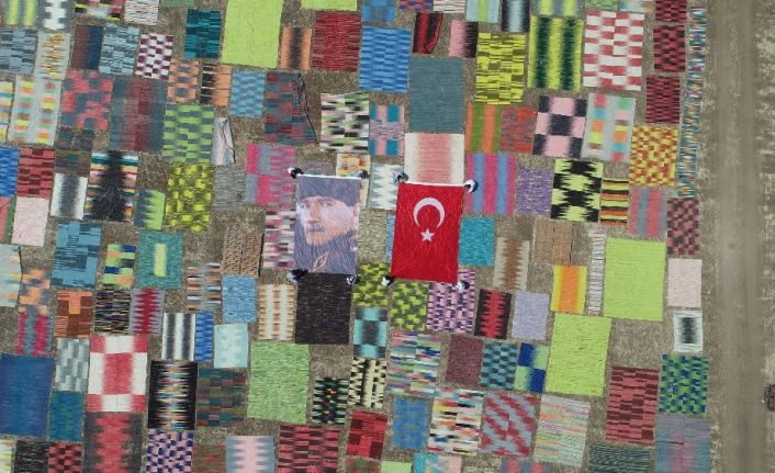 Halı tarlasının bölgedeki mahalle sakinlerinden oluşan çalışanları, 30 Ağustos Zafer Bayramı öncesi muhteşem bir çalışmaya imza attı. Halı tarlası çalışanları, rengarenk halıların arasında 20 metrekarelik Türk bayrağı ile dev Atatürk posteri açıp, birlik ve beraberlik mesajı verdi.