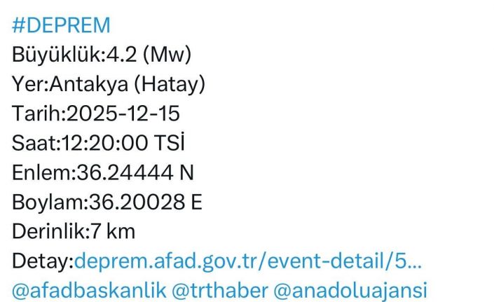 Hatay Valiliği tarafından yapılan açıklamada, "Hatay Antakya ilçesinde 4.2 Mw büyüklüğünde deprem meydana gelmiştir. Şu ana kadar 112 Acil Çağrı Merkezine herhangi bir olumsuz ihbar gelmemiştir. Gelişmeler takip edilmektedir" denildi.