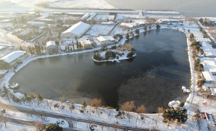 Kocaeli’de 5 gündür süren yoğun kar yağışının durması sonrasında hava sıcaklığı -4 derecelere kadar geriledi. Kar yağışının etkisini kaybetmesinin ardından düşen hava sıcaklığı beraberinde buzlanmayı da getirdi. -4 dereceye kadar inen sıcaklık sonrasında kent genelinde buz tutan kaldırımlarda vatandaşlar güçlükle yürümeye çalışırken, İzmit Fuar alanında bulunan kalp şeklindeki gölet ise buz tuttu. Buzlarla kaplanan göletin yüzeyinde martı ve göçmen kuşlar ise yiyecek aramaya başladı. Buz turan kalp şeklindeki İzmit Fuar Göletinin seyir zevki oluşturan görüntüsü ise havadan görüntülendi.