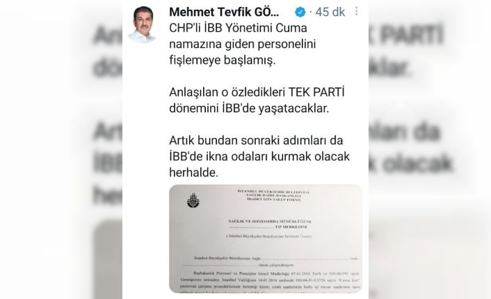 İstanbul Büyükşehir Belediye (İBB) Meclisi AK Parti Grup Başkanvekili ve Esenler Belediye Başkanı M. Tevfik Göksu, CHP’li İBB yönetiminin Cuma namazına gidenleri fişlediğini kaydetti.