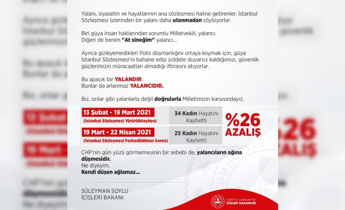 İçişleri Bakanı Süleyman Soylu, Cumhuriyet Halk Partisi (CHP)’ ne İstanbul Sözleşmesi tepkisi gösterdi. Bakan Soylu sosyal medya hesabından yaptığı paylaşımda, “Yalanlara karşı doğrularla huzurunuzdayız. Yalanı, siyasetin ve hayatlarının ana sözleşmesi haline getirenler, İstanbul Sözleşmesi üzerinden bir yalanı daha utanmadan söylüyorlar. Biri güya insan haklarından sorumlu Milletvekili, yalancı. Diğeri de "At sineğim" yalancı. Ayrıca gizleyemedikleri Polis düşmanlığını ortaya koymak için, güya İstanbul Sözleşmesi’ni bahane edip şiddete duyarsız kaldığımızı, güvenlik güçlerimizin müracaatları almadığı iftirasını atıyorlar. CHP’nin gün yüzü görmemesinin bir sebebi de, yalancıların ağına düşmesidir. Ne diyeyim, kendi düşen ağlamaz” açıklamalarında bulundu.