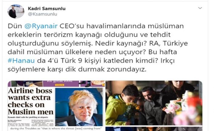 Ryanair CEO’su Michael O’Leary’nin dün yaptığı açıklamadaki, "Bombacı kimdir? Bunlar kendi başlarına seyahat eden bekar erkekler olacaklardır. Çocuklu bir aileyse geçip gitsin. Hepsini (aile üyelerini) havaya uçurma şansı sıfır. Bazı şeyleri söyleyemezsiniz, çünkü bu ırkçılık olur. Ancak (bombacı) genellikle Müslüman inancındaki bir erkek olacaktır. 30 yıl önce İrlandalıydı. Tehdit buradan geliyorsa tehdidi ona göre ele alın" sözleri tepki çekti. O’Leary’nin sözlerine tepki gösteren İGA CEO’su Kadri Samsunlu, sosyal medya hesabından yaptığı açıklamada, “O’Leary’nin bu sözleriyle ilgili kaynağını sorguladı: Dün Ryanair CEO’su havalimanlarında Müslüman erkeklerin terörizm kaynağı olduğunu ve tehdit oluşturduğunu söylemiş. Nedir kaynağı? RA, Türkiye dahil Müslüman ülkelere neden uçuyor? Bu hafta Hanau’da 4’ü Türk 9 kişiyi katleden kimdi? Irkçı söylemlere karşı dik durmak zorundayız” ifadelerini kullandı.