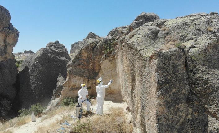 Türkiye’nin önemli turizm merkezlerinden Kapadokya bölgesinde peribacalarının üzerlerine sprey boyalar ile yazılan çirkin yazılar silindi.
