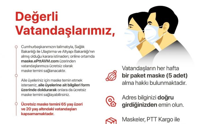 İletişim Başkanı Altun, sosyal medya hesabından yaptığı paylaşımda, "Cumhurbaşkanımız Recep Tayyip Erdogan’ın talimatıyla, Sağlık ve Ulaştırma Altyapı Bakanlığı’nın koordinasyonunda 20-65 yaş arası vatandaşlarımıza maske dağıtılacaktır. https://maske.epttavm.com adresindeki formu dolduran her vatandaşımızın evine haftada 5 adet maske teslim edilecektir” dedi.