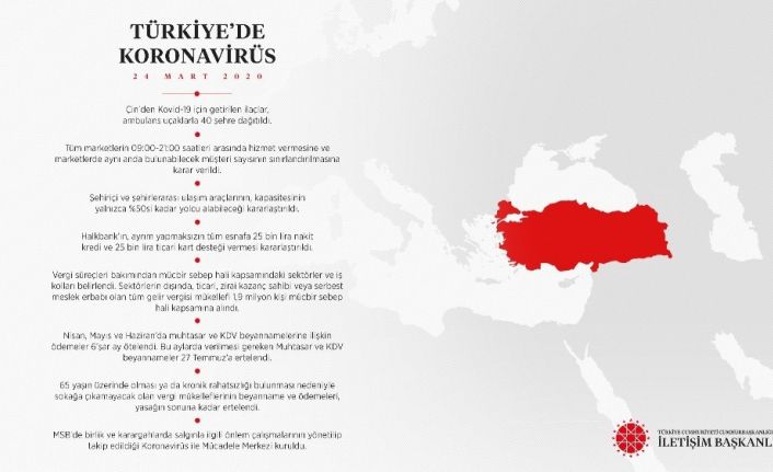 Altun’un paylaşımda, “Çin’den Kovid-19 için getirilen ilaçlar, ambulans uçakla 40 şehre dağıtıldı. Tüm marketlerin 09.00 - 21.00 saatleri arasında hizmet vermesine ve marketlerde aynı anda bulunabilecek müşteri sayısının sınırlandırılmasına karar verildi. Şehiriçi ve şehirlerarası ulaşım araçlarının, yüzde 50’si kadar yolcu alabileceği kararlaştırıldı. Halkbank’ın ayrım yapmaksızın tüm esnafa 25 bin lira ticari kart desteği vermesi kararlaştırıldı. Vergi süreçleri bakımından mücbir sebep hali kapsamındaki sektörler ve iş kolları belirlendi. Sektörlerin dışında, ticari, zirai kazanç sahibi veya serbest meslek erbabı olan tüm gelir vergisi mükellefi 1,9 milyon kişi mücbir sebep kapsamına alındı. Nisan, Mayıs ve Haziran’da muhtasar ve KDV beyannamelerine ilişkin ödemeler 6’şar ay ötelendi. Bu aylarda verilmesi gereken Muhtasar ve KDV beyannameler 27 Temmuz’a ertelendi. 65 yaşın üzerinde olması ya da kronik rahatsızlığı bulunması nedeniyle sokağa çıkamayacak olan vergi mükelleflerinin beyanname ve ödemeleri, yasağın sonuna kadar ertelendi. MSB’de birlik ve karargahlarda salgınla ilgili önlem çalışmalarının yönetilip takip edildiği Koronavirüs Takip Merkezi kuruldu” ifadelerine yer verildi.