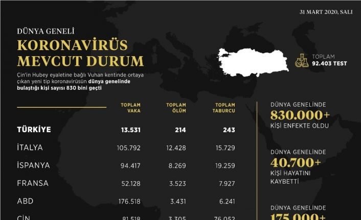 “Türkiye’de 30 bin 217 vaka, 649 ölüm, bin 312 kişi taburcu oldu. İtalya’da 132 bin 547 vaka, 16 bin 523 ölüm, 22 bin 837 kişi taburcu oldu. İspanya’da 135 bin 032 vaka, 13 bin 169 ölüm, 40 bin 437 kişi taburcu oldu. Çin’de 81 bin 708 vaka, 3 bin 3331 ölüm, 77 bin 078 kişi taburcu oldu. İran 60 bin 500 vaka, 3 bin 739 ölüm, 24 bin 236 kişi taburcu oldu. Fransa’da 98 bin 010 vaka, 8 bin 911 ölüm,17 bin 250 taburcu kişi oldu. ABD’de 356 bin 414 vaka, 10 bin 490 ölüm, 19 bin 247 kişi taburcu oldu. Birleşik Krallık’ta 51 bin 608 vaka, 5 bin 373 ölüm, 135 kişi taburcu oldu. Hollanda’da 18 bin 803 vaka, bin 867 ölüm, 250 kişi taburcu oldu. Almanya’da 101 bin 558 vaka, bin 662 ölüm, 28 bin 700 kişi taburcu oldu”
