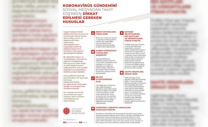 İletişim Başkanlığı tarafından, korona virüs gündemini sosyal medyadan takip ederken dikkat edilmesi gereken hususlarla ilgili açıklama yapıldı.