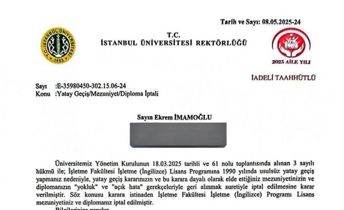 "Üniversitemiz Yönetim Kurulunun 18.03.2025 tarihli ve 61 No’lu toplantısında alınan 3 sayılı hükmü ile İşletme Fakültesi İşletme (İngilizce) Lisans Programına 1990 yılında usulsüz yatay geçiş yapmanız nedeniyle, yatay geçiş kararınızın ve bu karara dayalı olarak elde ettiğiniz mezuniyetinizin ve diplomanızın ’yokluk’ ve ’açık hata’ gerekçeleriyle geri alınmak suretiyle iptal edilmesine karar verilmiştir. Söz konusu karara istinaden İşletme Fakültesi İşletme (İngilizce) Programı Lisans mezuniyetiniz ve diplomanız iptal edilmiştir."