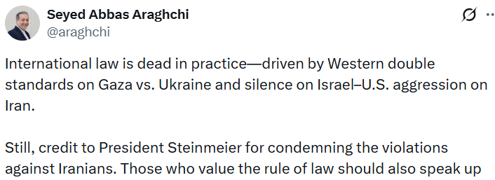 İran Dışişleri Bakanı Abbas Arakçi, "Uluslararası hukuk pratikte ölmüştür. Bunun nedeni, Batı’nın Gazze ve Ukrayna konusunda uyguladığı çifte standartlar ve İsrail ile ABD’nin İran’a yönelik saldırganlığı konusundaki sessizliğidir" dedi. Arakçi, hukukun üstünlüğüne değer veren herkesi yaşananlara karşı sesini yükseltmeye çağırdı.
