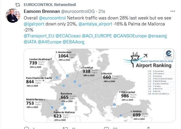 İstanbul Havalimanı, Avrupa Hava Seyrüsefer Güvenliği Örgütü (Eurocontrol) verilerine göre geçtiğimiz haftayı kapsayan 27 Eylül-3 Ekim tarihlerini kapsayan dönemde günlük ortalama 986 uçuşla Avrupa’da ikinci sırada yer aldı.
