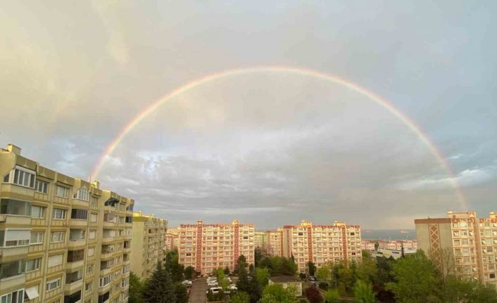 İstanbul’da kısa süreli etkili olan yağışlı havanın ardından gökyüzünde gökkuşağı belirdi. Gökkuşağı megakentin birçok noktasından görüldü. Günbatımı ile görsel şölen oluştu. Kartpostallık görüntüler kameraya yansıdı.