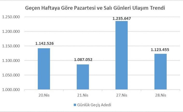 İstanbul Büyükşehir Belediyesi (İBB) yetkililerinden alınan bilgiye göre toplu ulaşım hareketliliği geçen haftanın aynı günlerine göre arttığı gözlendi. Trafikteki özel araç yoğunluğunun yüzde 42 arttığı belirtildi. İstanbul’da toplu ulaşım araçlarında 20 Nisan Pazartesi günü, 1 milyon 142 bin 526 geçiş yapılmasına karşın, 27 Nisan Pazartesi günü ise 1 milyon 235 bin 647 geçiş sağlandı. Geçiş sayısında yüzde 8,15’lik bir artış yaşandı. 21 Nisan salı günü ise toplu ulaşım araçlarından 1 milyon 87 bin 52 geçiş oldu. 28 Nisan salı günü ise 1 milyon 123 bin 455 geçiş yapıldı.