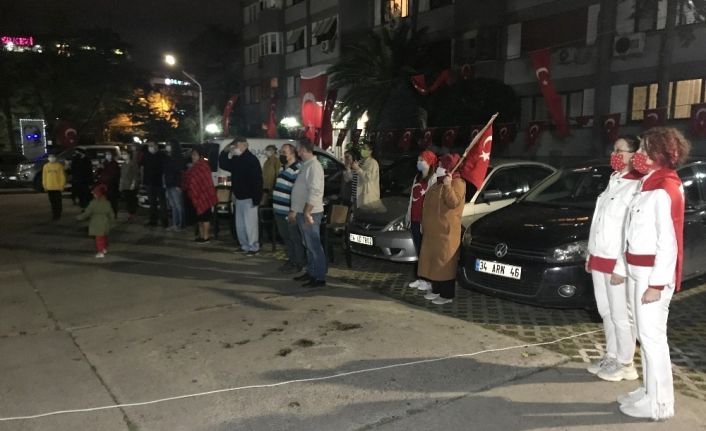 Cumhuriyet Bayramı’nın 97. yıldönümünde vatandaşlar ellerinde bayraklarla pencere ve balkonlara çıktı. Bakırköy’de 19.23’te sokağa çıkan vatandaşlar İstiklal Marşı’nı okudu.