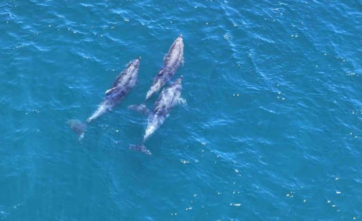 Yaz mevsiminde daha çok görünün yunusların İstanbul’da masmavi denizde dans edercesine yüzdüğü anlar havadan görüntülendi. Yunusların kimi zaman diğer grup üyeleriyle kimi zamanda tek başlarına balık avlarken ortaya çıkardığı manzara belgeselleri aratmadı.