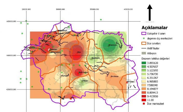 “Eskişehir ve ilçelerinin deprem tehlike haritasının hazırlanmasında kullanılan değişkenler; aktif fay uzunluğu, deprem dış merkez nokta sayısı, alüvyon alan büyüklüğüdür. Bu değişkenler istatistik ve Coğrafi Bilgi Sistemleri yöntemleri ile birlikte değerlendirilerek, bu değişkenlere göre tehlikeli ilçeler belirlenmiş ve Eskişehir il sınırı içinin deprem tehlike haritası hazırlanmıştır. Bu çalışma sonucunda Eskişehir il sınırı içinde deprem tehlikesi açısından Tepebaşı, Alpu, Mahmudiye, Mihalgazi ve İnönü ilçeleri ilk 5 sıra içine girmektedir. Deprem tehlike haritası yorumlandığında Eskişehir il sınırları içinde tehlikeli yerlerin ilin kuzeybatı tarafı olduğu görülür. Eskişehir merkez ilçeler, İnönü, Alpu, Mahmudiye ve Mihalgazi ilçeleri bu gruba girerler. Bu ilçelerde deprem oluşturabilecek aktif fayların yanı sıra, 1901 yılından günümüze kadar olan depremlerin dış merkez noktaları da bu ilçeler sınırları içinde yer almaktadır. Yine deprem sırasında açığa çıkan enerji bu ilçeler içinde geniş alanlar kaplayan alüvyon adı verilen birim üzerinde bulunan yapıları daha fazla etkilemekte ve yıkımlara neden olmaktadır. Eskişehir il sınırları içinde deprem tehlikesi açısından Beylikova ve Mihalıççık az tehlikeli ilçeler olmaktadır. Odunpazarı, Seyitgazi ve Çifteler ilçeleri ise, orta tehlikeli ilçeler sınıfına girebilir. Tepebaşı ve Odunpazarı arasındaki fark Odunpazarı ilçesinin genellikle Tepebaşı ilçesine göre kayalık zemin üzerinde olmasından kaynaklanmaktadır. Buna karşın Tepebaşı ilçesinin büyük kısmı alüvyon zemin üzerinde yer alır. Yapılan bu deprem tehlike haritası öncelikle uygulamacılara ön bilgi vermek amaçlıdır. Bu çalışma küçük ölçekli bir çalışmadır. Bu çalışma temel alınarak büyük ölçekli çalışma yapıldığında genellikle Porsuk Nehri’nin kenarlarında Odunpazarı ilçesi sınırları içinde deprem tehlikesi açısından yüksek yerler çıkacaktır. Jeoloji Mühendisleri Odası Eskişehir Şubesi olarak deprem konusunda sorumluları bir kez daha uyarır, çalışmanın sadece Tepebaşı ve Odunpazarı ile sınırlı kalmaması, tüm ilçeleri kapsayan ayrıntılı çalışmaların gerektiğini belirtiriz.”