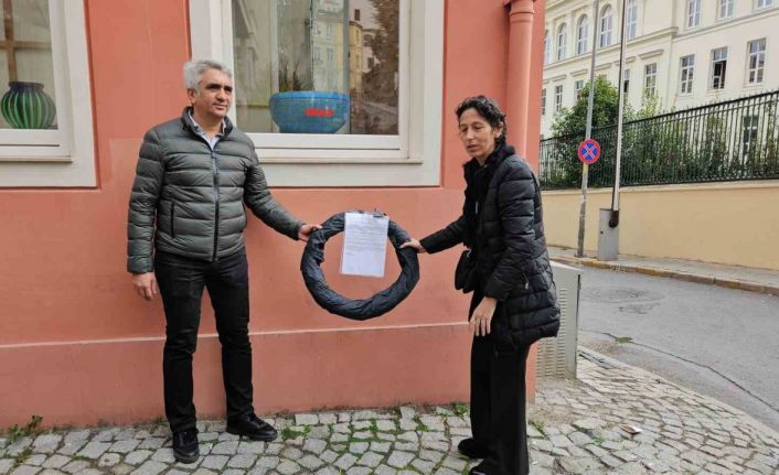 Yapılan basın açıklamasının ardından mağdur veli ve öğrenciler konsolosluk önüne siyah çelenk bıraktı.
