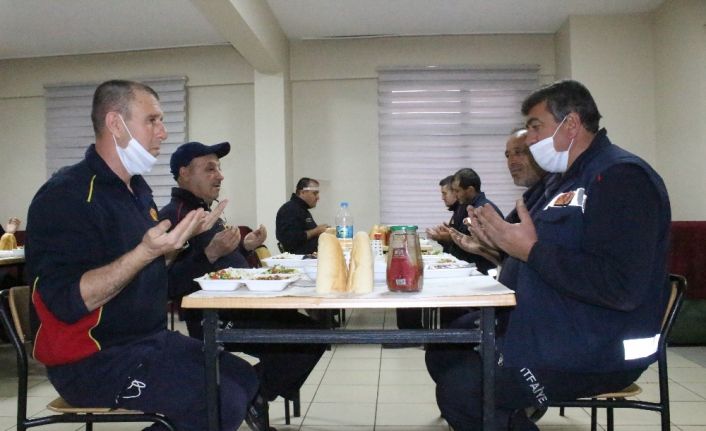 Uşak İtfaiye Müdürlüğüne bağlı itfaiye ekipleri, akşam nöbeti esnasında oruçlarını açmak için hep birlikte hazırlıklara başladı. Ekip içindeki bazı itfaiyeciler yemek hazırlarken, bazısı ise masaları hazırladı. Sosyal mesafe kuralına uyarak sıraya giren itfaiye erleri, yemeklerini alarak masalara oturdu. Ezanın okunmasıyla birlikte masaları başında yemek duası yapan çalışanlar, ardından oruçlarını açtı. Yemek esnasında dahi kulakları telsizde olan erler, olası bir ihbara karşı her daim hazır bekliyor.