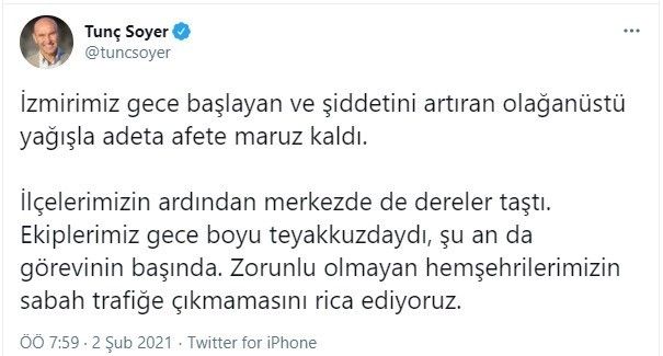 İzmir Büyükşehir Belediye Başkanı Tunç Soyer, kentteki aşırı yağışlarla ilgili, “İzmirimiz gece başlayan ve şiddetini artıran olağanüstü yağışla adeta afete maruz kaldı. Zorunlu olmayan hemşehrilerimizin sabah trafiğe çıkmamasını rica ediyoruz” dedi.