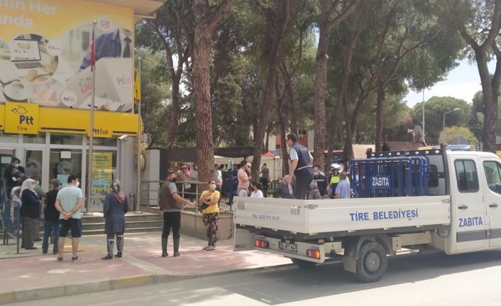 izmir’in Tire ilçesinde maaşlar, yardım ve destek ödemeleri için PTT’ye giden vatandaşlar kalabalık oluşturunca polis duruma müdahale etti.