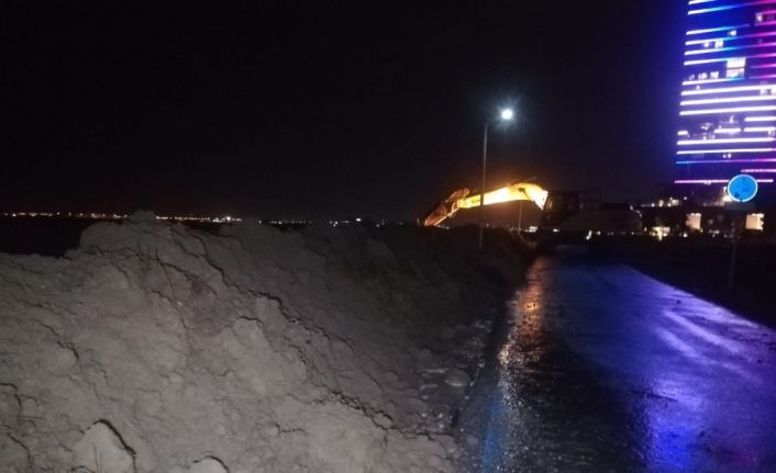 İzmir’in Karşıyaka ilçesinde sağanak yağışlardan dolayı denizin taşarak çok sayıda site bahçesi, bazı dükkanlar ve araçların su altında kalmasının ardından yeni bir taşkına karşı sahil bandına yaklaşık 2 kilometre kumdan set oluşturuldu.