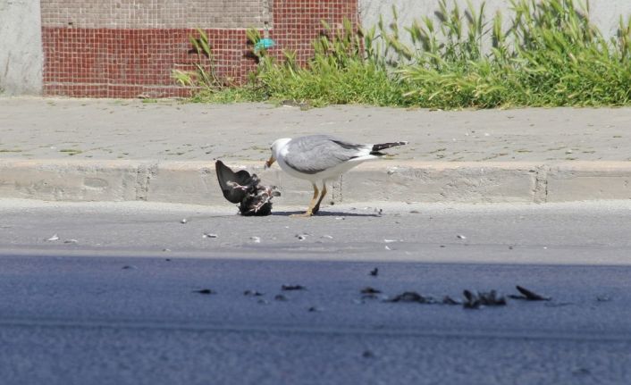 İzmir’de sokağa çıkma kısıtlamasının 4. gününde meydanlar, caddeler ve sokaklar yine hayvanlara kaldı. Konak ilçesinde bulunan Gaziler Caddesi’nde ise belgesellere konu olacak bir olay yaşandı. Kuşlarıyla ünlü Basmane Tren Garı’nın yanında bulunan Gaziler Caddesi’nde bir martı, ölü bir güvercin buldu. Caddenin üzerinde pek fazla trafik olmaması sebebiyle martı, güvercini gaga darbeleriyle yedi. Bu sırada geçen bazı araçlardan korkan martı, araç geçişlerinden sonra tekrar güvercinin başına geldi. Gagasını kullanarak ölü güvercini kaldırıma doğru getiren martı, bir süre sonra leşin başından ayrıldı.
