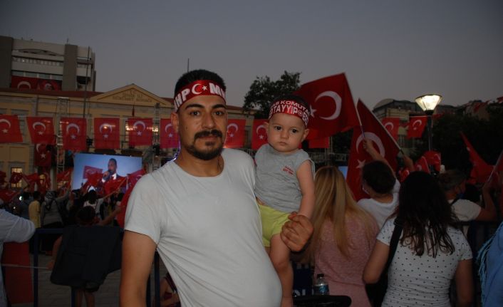 Alana 15 Temmuz’un seyrini değiştiren Şehit Ömer Halisdemir’in adını verdiği çocuğuyla katılan Kuddusi Karadağ, "Şehitlerimiz bizim onurumuz, şerefimiz. Rabbim mekanlarını cennet eylesin. Benim çocuğumuz adı Ömer Halisdemir Karadağ. Biz şehitlerimizi yaşatacağız, yaşatmaya devam edeceğiz. Bu varoluş bizim için onurdur" diye konuştu. Konak Meydanı’nda eşiyle birlikte törene katılan Necip Uludağ, "Bugün bizim için çok anlamlı. Çünkü her türlü vesayet sistemine karşı bütün dünyaya milli birliğimizi haykırdığımız bir gündür. Batının bütün emperyalist güçler ile birlikte terör örgütü FETÖ’nün ülkemizden kazındığı bir milattır bizim için. Biz de bu yüzden 15 Temmuz’u önemsiyor ve çok değerli buluyoruz" dedi. Eşi Hatice Uludağ ise "15 Temmuz 2016 akşamı da biz buradaydık. O gece eşimle helalleşerek ayrıldık. Sonra tekrar bir araya gelerek, iki çocuğumuzla birlikte burada sabahladık. Yine olsa yine geliriz, kesinlikle canımızı düşünmüyoruz. Çünkü devlet elden giderse canımızın bir anlamı kalmayacak" açıklamasında bulundu.
