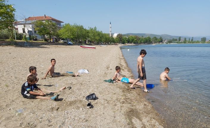 Bursa’nın İznik ilçesinde havaların ısınmasını fırsat bilen çocuklar göle akın etti.