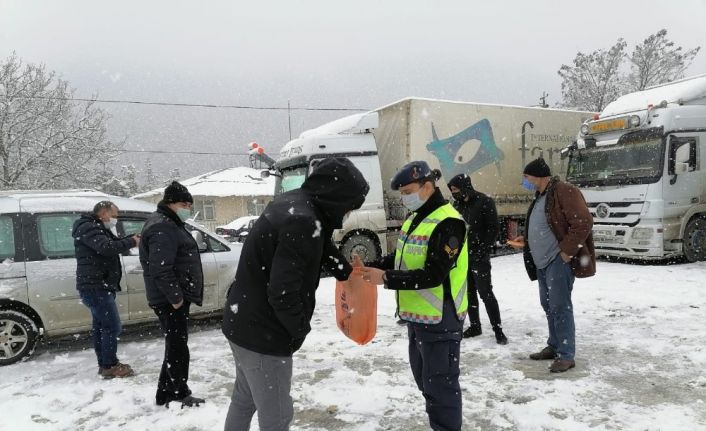 Ardahan’da Jandarma ekipleri tipinin dinmesini bekleyen araç sürücülerine çay ve yiyecek ikram etti.