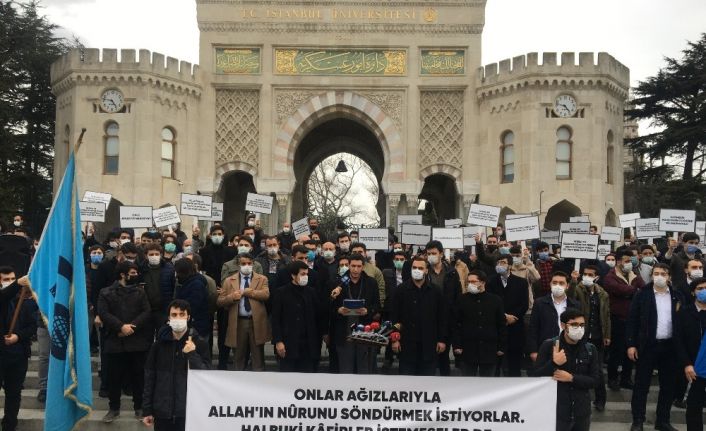 Anadolu Gençlik Derneği ve Milli Gençlik Vakfı üyeleri, ikindi namazının ardından Beyazıt Meydanı’nda toplandı. Grup üyeleri, basın açıklaması öncesinde Saff Suresi’nin 8. ayeti olan “Onlar ağızlarıyla Allah’ın nurunu söndürmek istiyorlar. Halbuki kafirler istemeseler de Allah nurunu tamamlayacak” yazılı pankartı açtı. Boğaziçi Üniversitesi’ndeki sergide Kabe fotoğrafının yere serilmesi tekbirlerle protesto edildi. Kur’an-ı Kerim tilavetinin okunmasının ardından basın açıklamasına geçildi. Düzenlenen eyleme çok sayıda sivil toplum kuruluşu ve siyasi parti de destek verdi.