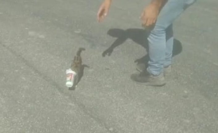 Afyonkarahisar’da kafası ayran kutusuna sıkışan yavru kedinin imdadına o esnada yoldan geçen bir minibüsteki vatandaşlar yetişti.