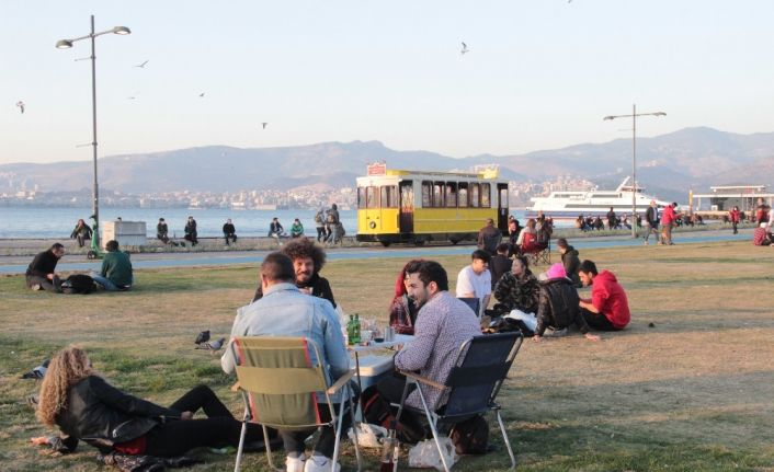 Korona virüs tedbirleri kapsamında kafe ve restoranların kapanması sonrası İzmirli vatandaşlar soluğu sahilde aldı. Hafta sonu uygulanan sokağa çıkma kısıtlaması nedeniyle birkaç saat vakit geçirip 20.00’de olacaklarını belirten İzmirliler, gruplar haline aralarına mesafe koyarak vakit geçirmeye özen gösterdi.