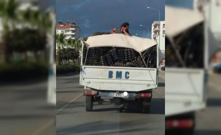 Antalya’da seyir halindeki kamyonetin arka tente kısmına uzanıp yolculuk eden vatandaş pes dedirtti.
