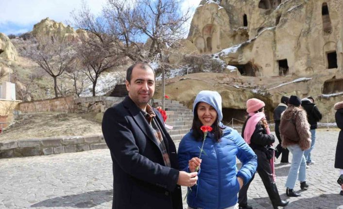 Nevşehir’de 8 Mart Dünya Kadınlar Günü dolayısıyla Göreme Açık Hava Müzesi’ni ziyaret eden yerli ve yabancı kadın turistler çiçeklerle karşılandı.