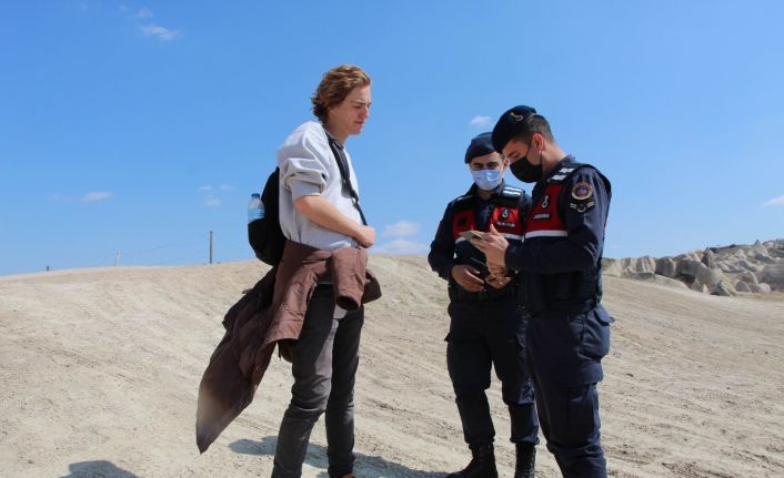 Nevşehir’in merkez ilçeye bağlı Göreme beldesinde bulunan Kılıçlar Vadisinde jandarma araçlarının devriye gezerek Türkçe ve İngilizce anonslarla maske uyarısı yapması dikkatlerden kaçmazken maske takma kuralına tüm uyarılara rağmen uymayan 37 yabancı turiste para cezası kesildi.