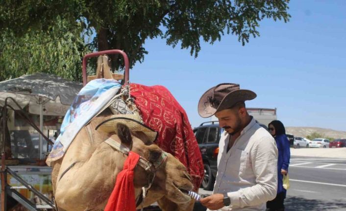 Ürgüp ilçesi Üç güzeller mevkiinde turistlere deve turu yaptıran Muhammed Harput, 40 dereceyi aşan sıcaklık nedeniyle huysuzlaşan devesine günde en az 10 külah dondurma yedirdiğini söyledi. Devesine belirli aralıklarla dondurma veya soğuk yiyecekler verilmediği zaman huysuzlaştığını belirten Harput, “Devemiz sıcak havalarda hararet yapıyor. Müşteri üzerindeyken huysuzlaşıyor. Biz de devemize dolaplarda beklettiğimiz karpuz kabukları ve dondurma veriyoruz. Bu sayede hararetini indirmeye çalışıyoruz” şeklinde konuştu.