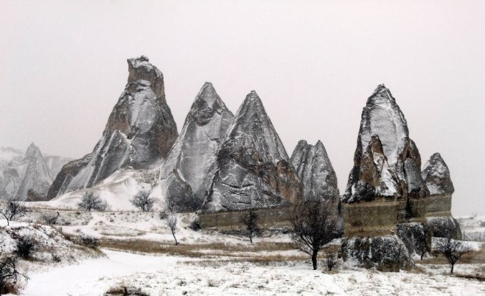 Türkiye’nin önemli turizm merkezlerinden Kapadokya bölgesinde yağan kar yağışıyla birlikte peribacaları tablo gibi fotoğraflar verdi.