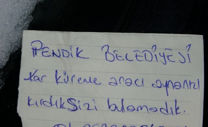 Pendik Belediyesinde görevli kar küreme ekipleri karla kaplanan yolları açmak için çalıştıkları sırada bir vatandaşın aracının aynasına çarparak kırdı. Aracın sahibini bulamayan görevliler, “aracın aynasını kırdık, sizi bulamadık” yazısı ile telefon numarası yazılı bir kağıdı aracın camına bıraktı. Sabah uyandığında aracının kırık aynasını ve camdaki notu gören araç sahibi duygulanarak o notu sosyal medya hesabından paylaştı. Pendik Belediyesi ekipleri de yeni bir ayna alarak aracın sahibine verdi.