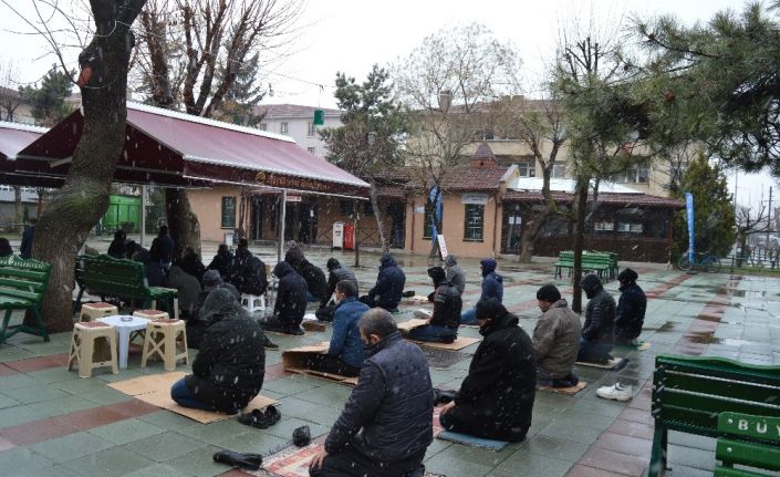Eskişehir’de bazı vatandaşlar, sabah saatlerde başlayan ve öğlen saatlerinde şiddetini arttıran kar yağışı altında cuma namazı ibadetini cami dışında açık alanlarda yerine getirdi.