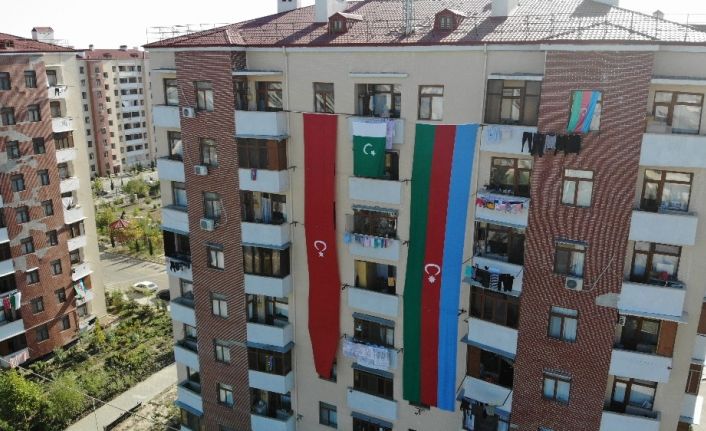 Azerbaycan’ın Mingeçevir kentinde yarım asırdır terzilik yapan Valeh Mehmetzade, terzi dükkanında diktiği dev Azerbaycan ve Türkiye bayrağını 9 katlı binaya asarak Azerbaycan ordusuna destek verdi.