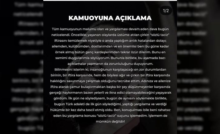 Yaptığı yazılı açıklamada davanın bugün neticelendiğini belirten, ailesinden dostlarından ve bugüne kadar kendisini örnek alan tüm gençlerden özür dilediğini ifade eden ünlü futbolcu Arda Turan, “Öncelikle; yaşanan olaylarda üstüme atılan çirkin "sözlü taciz" mirasını temizlemek niyetiyle o anda yaptığım anlık hatalardan dolayı; ailemden, kulübümden, dostlarımdan ve en önemlisi beni bu güne kadar örnek almış bütün genç kardeşlerimden tekrar özür dilerim. Bunu en samimi duygularımla söylüyorum. Bununla birlikte, bu aşamada bazı açıklamalar yapmanın da zorunluluğunu duyuyorum. Bilinmesini isterim ki; insanoğlunun karşılaşacağı en zor durumlardan birinin, bir iftira karşısında, hem de böylesi ağır ve çirkin bir iftira karşısında haklılığını savunmaya çalışmak olduğunu tecrübe ettim. Adınıza ve ailenize iftira atarak çamur bulaştırmaktan başka bir şey düşünmeyenler karşısında gerçeği haykırmanın bazen yeterli ve ikna edici olamayabileceğini yaşayarak gördüm. İlk gün ne söylediysem, bugün de aynısını söylemekte birlikte, bugün Türk adaleti de ilk gün söylediğimi, yaptığı yargılama ve verdiği hükümle bir kez daha tescil etmiş oldu. Ben, konuşulması bile beni rahatsız eden bu yargılama konusu, sözlü taciz suçunu işlemedim. İşlemem de mümkün değildir. Bugün itibarıyla tüm kamuoyunu; bu iddiaların ortaya atıldığı günlerde söylenenleri, yapılan sözde haberleri ve mahkemeye dahi saygı duymayarak kendilerine uzatılan her mikrofonda devam eden yargılamayı etkilemeye yönelik beyanları verenleri hatırlamaya; bu olayı adeta kendilerini öne çıkarıcı bir reklam malzemesi olarak kullananların kimler olduğunu düşünmeye davet ediyorum” ifadelerine yer verdi.