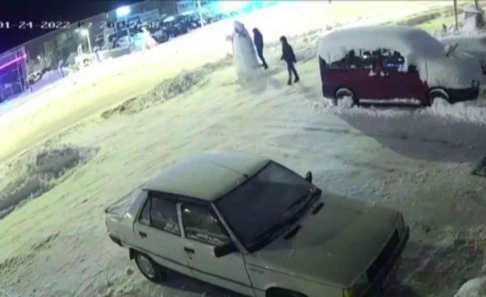 Yozgat’ın Sorgun ilçesinde iki kişinin, kardan adamın kafasını yumrukla yıkmaları güvenlik kamerasına yansıdı. Aynı dakikalar içerisinde olay yerinden geçen bir başka kişinin ise kardan adamın kafasını önce yerine koymaya çalıştığı, bunu yapamayınca kardan adamın kafasında bulunan şapkayı kendi kafasına takıp olay yerinden uzaklaştığı görüldü.
