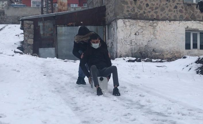 Kars’ta kar yağışı en çok çocuklara yaradı. Sarıkamış’ta kar topu oynayan çocuklar, buldukları boş bidona binerek kaymanın tadını çıkardılar.