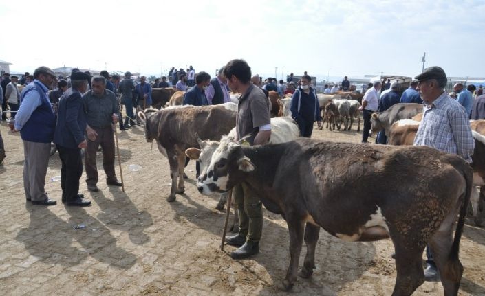Hayvan pazarında, satıcılar, hayvanlarını satmak için yoğun mücadele verirken, bayrama bir gün kala yoğunluğun yaşandığı pazarda, alıcılar ise pazarlık yaparak fiyatların biraz daha düşmesi bekliyor.