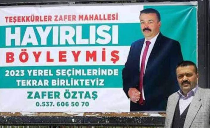 Konya’nın Karapınar ilçesinde 2019 yılında yapılan Mahalli İdareler Genel Seçimlerinde mahallesinde muhtar adayı olan ve seçilemeyen Zafer Öztaş, buna rağmen pankartlar hazırlatıp mahalle sakinlerine teşekkür etti. 31 Mart seçimlerinde mahallesinde tekrar aday olan Zafer Öztaş, bu seçimde kazanarak muhtar seçildi.