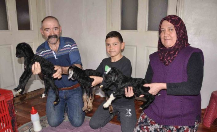 Mangırlar köyünde ikamet eden Öztürk ailesinin yüzü, keçilerinin üçüz doğurmasıyla güldü. Hamile keçi, geçtiğimiz günlerde rahatsızlandı. 10 keçi ve 15 koyunu bulunan Alaaddin Öztürk, keçinin doğumunun başlamasıyla önce birinci yavruyu kucağına aldı. Hayvan ayağa kalkmayınca ikinci doğum da gerçekleşti. İkinci doğumun ardından yine ayağa kalkamayan keçinin karnına dokunan Öztürk, bir yavru daha olduğunu hissetti. Doğumun yaklaşık 5. dakikasında keçi, üçüncü yavrusunu da doğurdu. Öztürk, sağlıklı dünyaya gelen oğlakları üşümemeleri için evine aldı. Sobanın yanında bakılan oğlaklar, annesinden sağılan sütle biberonla besleniyor. Bir hafta boyunca evde bakılacak olan üçüzler, sonra annesine kavuşacak.