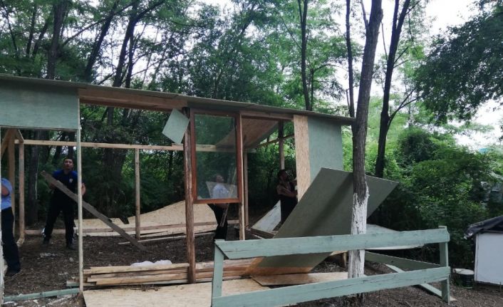 Eyüpsultan Belediyesi Zabıta Müdürlüğü ekipleri, en son Kemerburgaz Mimar Sinan Mahallesi Dere Sokak’ta mülkiyeti Milli Emlak’a ait olan arazi üzerinde ahşap malzemeden yapılmış dört adet kaçak ahşap yapının yıkımını gerçekleştirdi.