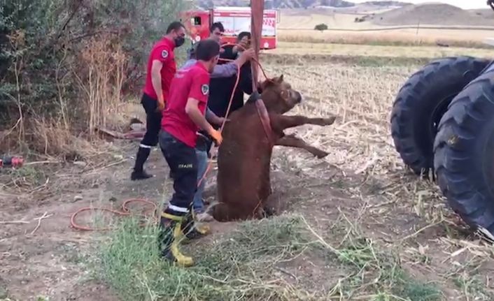 Kırıkkale’de arazide otlarken 3 metrelik foseptik kuyusuna düşen düve, kepçe yardımıyla itfaiye ekiplerince kurtarıldı.
