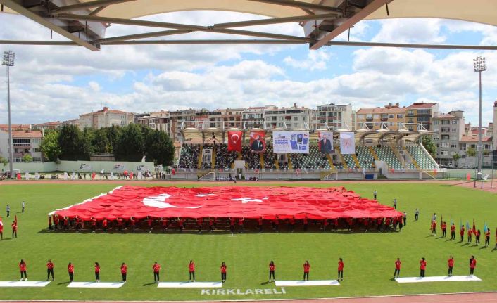 Tüm ülkede olduğu gibi Kırklareli’de de coşkuyla kutlanan 19 Mayıs Atatürk’ü Anma, Gençlik ve Spor Bayramı’nda öğrenciler, stadın ortasında dev Türk bayrağı açtı.